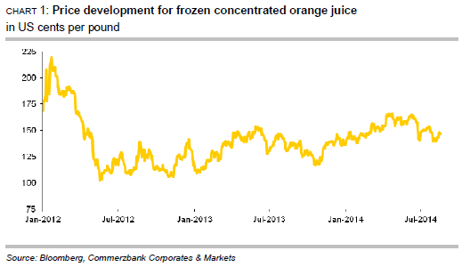 Moreover, the drought in Brazil spurred doubts as to whether rising production in Brazil would be able to compensate for the decline in the US. For Brazil, the USDA had predicted in January that the 2013/14 orange harvest would increase by 8.5%, but this forecast was cut to 6% in July. This still remarkable rise is largely attributable to high yields. The quantity of oranges used for processing is seen to rise at a similarly strong rate. As a result, Brazil’s orange juice production, which had fallen massively by almost a quarter in 2012/13, is now expected to post a 12% increase.