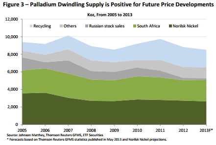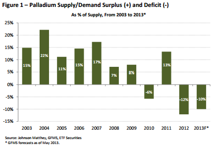 The palladium market experienced a large deficit last year and demand is expected to outstrip supply by at least 850 thousand ounces in 2013 equivalent to 10% of global supply, according to a number of industry experts (Figure 1). With supply structurally limited by falling ore grades and the expected depletion of Russian government stocks, the palladium price appears to be in a good position to benefit from the recent pick-up in auto sales.
