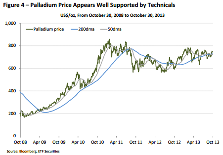 The palladium market is likely to remain plagued by a structural deficit due to a combination of increasing demand for autocatalysts and declining supply. We believe that the palladium price has strong upside potential. From a technical point of view, the palladium price appears to be well supported, after having breached its 50dma and 200dma a few weeks ago (Figure 4). We identify the next resistance level in the region of US$760-780oz. Should this be breached, palladium is expected to return to trade above US$800oz, targeting the 2011 highs of US$858oz.