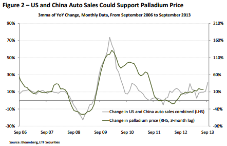 With over 65% of palladium demand coming from autocatalysts,the palladium price is strongly linked to the outlook for vehicle sales in China and the US, the two biggest auto markets in the world. Combined annual sales in China and the US amounted to over 35 million vehicles in 2012 and were up 14% in the nine months to September 2013 compared to a year earlier. However, this sharp rise appears not to have been reflected in the palladium price yet (Figure 2). With China auto sales expected to surpass 20 million this year and US light vehicle sales forecasted to climb to 15 million, we believe palladium price has upside potential.