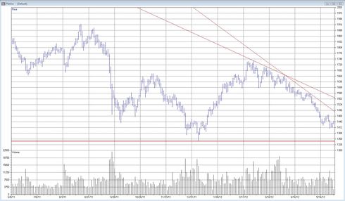 Ett titt i backspegeln idag visar att vårt efterlängtade genombrott av den fallande trenden, fortfarande inte inträffat. Istället har Platina fortsatt ned och så sent som förra veckan fick vi en ny lågpunkt. Det var den 23 maj och nivån 1 406 USD/oz.