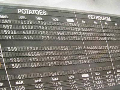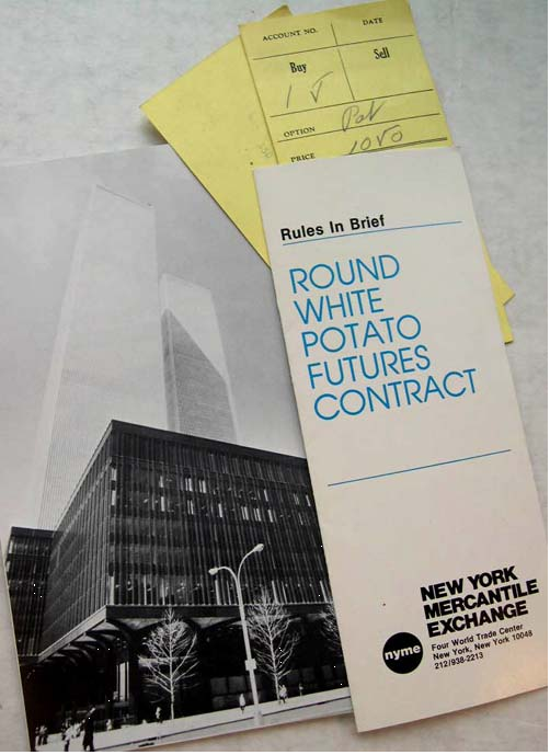 Terminskontrakt avseende potatis handlades tidigare på New York Mercantile Exchange där ”runda vita potatisar” var den enda grönsaken som handlades. I New York hade emellertid NYMEX en rad problem med just handeln i potatis under 1970-talet. Under 1976 uppdagades det att det saknades nästan 50 miljarder pounds potatis i lagren jämfört med den öppna volymen, något som orsakade tvister mellan producenter, medlemmar på NYMEX och börsens tillsynsmyndigheter. I ett slag sjönk volymerna i potatishandeln med 45 procent jämfört med 1975 samtidigt som priset på ett börsmedlemskap föll från 47.000 USD ned till 5.000 USD.