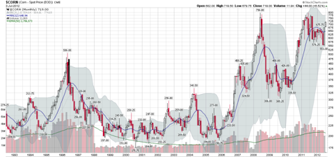 Diagrammet nedan visar de månatliga stängningskurserna för majsterminerna de senaste tjugo åren. Observera att medan den senaste månadens prisuppgång ser imponerande ut så bleknar den i jämförelse med de toppar vi såg i majspriset under 1994-1996, 2005-2008 samt 2010-2011.