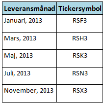 *3 avser årtalet, vilket betyder att tickern RSK3 avser leverans av raps i maj 2013.
