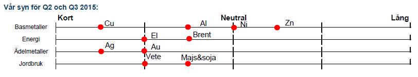 Februari månads kraftiga uppgång på 25% i oljepriset fick ett abrupt slut i mars när marknadens fokus återvände till underliggande fundamenta som i våra ögon inte förbättrats trots att snart nio månader passerat sedan oljeraset startade i juli 2014. Olja är inte bara centralt för världsekonomin, det är också den råvara med störst inflytande på produktionskostnaden för andra råvaror. Det är därför svårt att se stora prisuppgångar i metaller eller elpriser när de lägre oljepriserna fortsätter att äta sig in i produktionskostnaden för råvaror.