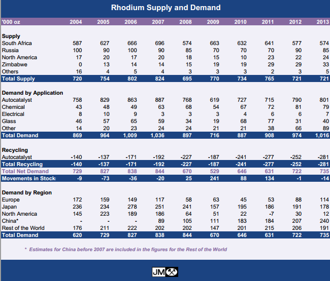 Deutsche Bank i Johannesburg har en prognos för rodiumpriset på 1250 USD per ounce för 2014 och en långsiktig prognos på 4000 USD. Vilket kan jämföras med dagens pris på 925 USD.