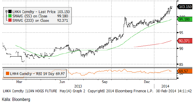 Lean hogs maj-kontrakt har fortsatt att stiga och priset ligger nu över 100 cent per pund. Trenden är tydligt uppåtriktad, vilket innebär att det är mer sannolikt att priset fortsätter upp, än att det vänder ner.