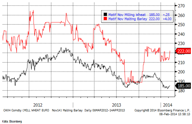 November 2014 – kontraktet på maltkorn håller sig stabilt när vetet visar svaghet. Som vi skrev i höstas, är maltkorn förmodligen en gröda som bör betala sig bra i år. Dessutom är det fotbolls-VM i sommar och kan öka efterfrågan på maltkorn. I veckan handlades terminerna för novemberleverans upp till 222 euro per ton och vidgade därmed premien till kvarvetekontrakten på Matif.