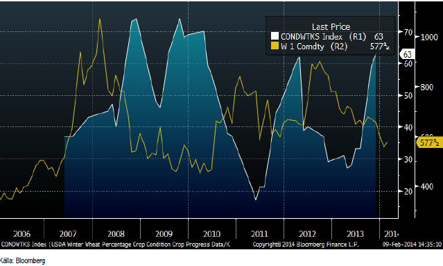 Crop condition som NASS i några delstater publicerade i måndags den 3 februari var en chock för marknaden. I Kansas är 3% av höstvetet ”very poor”, 17% ”poor”, 45% ”fair”, 33% ”good” och 2% ”excellent”. När höstvetet gick in i vintervilan vid den sista crop condition-rapporten den 22 november var 63% i good/excellen condition. Nu är det alltså 35%, dvs 28%-enheter lägre.