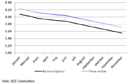 Nedan ser vi terminspriserna man får i svenska kronor från terminspriserna på SMP och smör på Eurex, omräknat till kronor per kilo mjölkråvara. Notera att hela den här prisnivån alltid ska ligga över avräkningspriset på mjölkråvara med ca 50 öre, som är en uppskattning av kostnaden för att förädla mjölkråvara till SMP och smör.