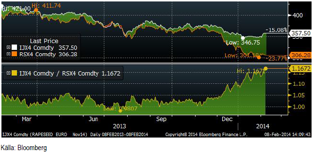 I diagrammet nedan ser vi hur spotkontrakten handlat mot varandra de senaste fem åren. Rapsfröet är helt enkelt onormalt dyrt just nu.