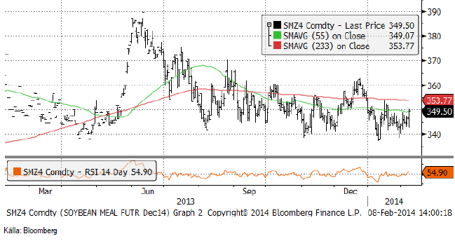 November 2014-kontraktet på raps följde sojabönorna upp i veckan som gick. Rapskaka har som bekant blivit ett viktigt alternativ i foderblandningarna i EU till sojabönor. Vi tycker dock alltjämt att rapspriset för ny skörd borde vara väsentligt lägre och tycker att den här prisuppgången ger ett utmärkt tillfälle att sälja terminer för ny skörd.