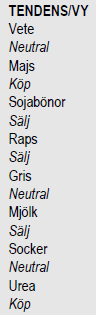 Det mest sannolika är att priset på vete går ner, men ”risk/reward” är helt klart på uppsidan, så vi väljer att gå ur korta positioner på vete. Än så länge stannar vi med neutral rekommendation.