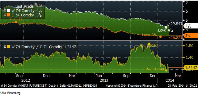 Vetekontrakten för decemberleverans i Chicago har blivit billigare än någonsin tidigare i förhållande till majs. Tidigare har vi sett spotpriset på majs ligga över majspriset, men inte i kontrakten för ny skörd. Vete ser alltså ”billigt” ut i förhållande till majs nu.