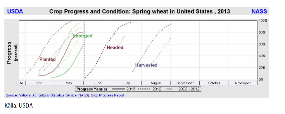 Den största producenten, North Dakota, ligger fortfarande sist med endast 64% av sådden avklarad, jämfört med dess femåriga genomsnitt på 89% vid den här tiden. Rapporten visade också för första gången tillståndet för vårvetet, varav 8% klassas som ”poor/very poor”, medan 64% klassas som ”good/excellent” – att jämföra med förra årets 2% resp 78%.