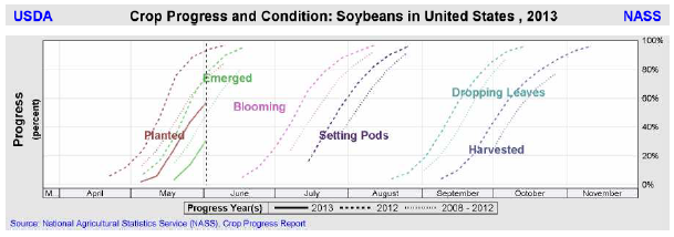 Måndagens Crop Progress visar att lantbrukarna fortsätter att göra framsteg vad gäller sådden av majs, vilken också översteg marknadens förväntningar, trots ihållande regn över majsbältet. Som nämnt ovan, var sådden per den 2 juni i de 18 största majsproducerande staterna avklarad till 91%, en ökning från 86% en vecka tidigare men något lägre än det femåriga genomsnittet på 95% vid den här tiden. Vårens kalla och blöta väder över majsbältet har gjort att årets sådd ligger något efter förra årets sådd som var avklarad vid den här tiden.