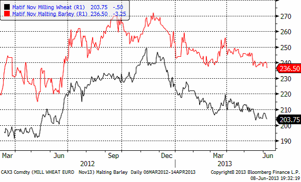 Maltkornet höll sig någorlunda starkt i veckan, men om vetet fortsätter ner, får vi nog se ett nedställ på maltkornet också. Trenden är tydligt nedåtriktad.