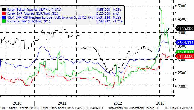 Fonterra-noteringen har fortsatt att falla och ligger nu bara strax över Eurex terminspris på SMP. Medan SMP sjunkit något även på Eurex, har priset på smör på Eurex fortsatt att stiga.