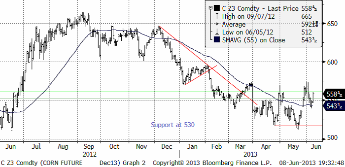 Majspriset (december 2013) har liksom vetet fått stöd den senaste tiden. Efter årslägsta notering i slutet av maj har priset stigit kraftigt uppåt, rekylerat ner och i fredags börjat ett nytt försök uppåt. Än så länge rör sig priserna under den nivån som uppnåddes innan plantings-rapporten från USDA i slutet av mars, men ett test av den nivån kan komma och i så fall kan priset nå ändå upp mot 600 cent. Det vore verkligen ett ödets ironi att vad som väntas bli den största skörden någonsin följs av prisuppgång. Fredagens prisuppgång följde på en förnyad prognos om kallt och vått väder i USA.