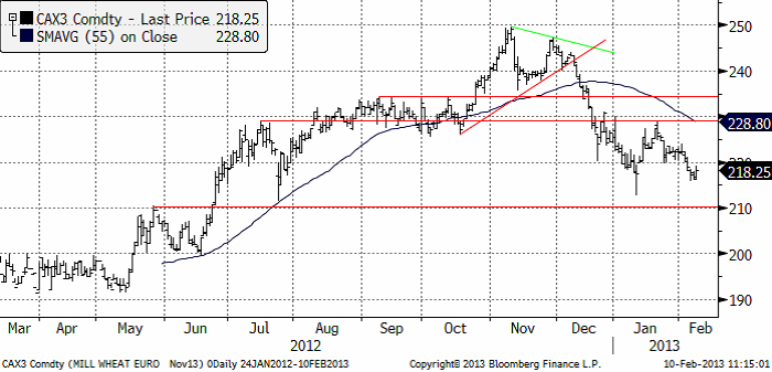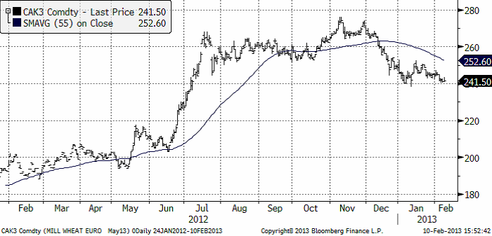 Priset på november (2013) kontraktet har den senaste tiden fallit betydligt mer än maj-kontraktet, som vi ser i diagrammet nedan. WASDE-rapporten som kom i fredags kväll, var något av en ickehändelse. WASDE-rapporten har mer bäring på novemberkontraktet än på maj-kontraktet. De något mer bullish / oroväckande nyheterna från Ryssland och Egypten påverkar inte novemberkontraktet lika mycket som majkontraktet.