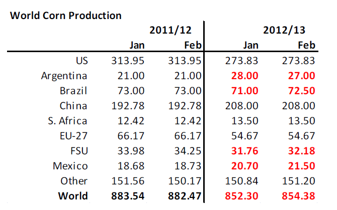 Så nu till WASDE-rapporten. USDA:s estimat (gissningar) om produktionen för 11/12 och 12/13 ser vi nedan. Man gjorde en liten sänkning endast på fd Sovjets produktion. Brasiliens (Other) sänktes också.