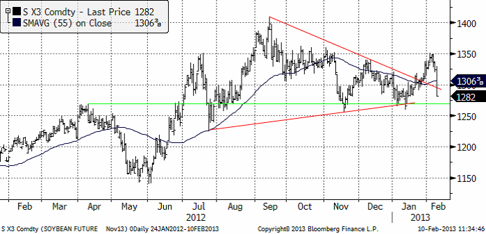 Sojabönorna (november 2013) föll kraftigt efter WASDE-rapporten i fredags. Nästan ända ner till de tekniska stöden vid 1260 cent per bushel. Nedanför ser vi kurdiagrammet för sojabönor (november 2013).