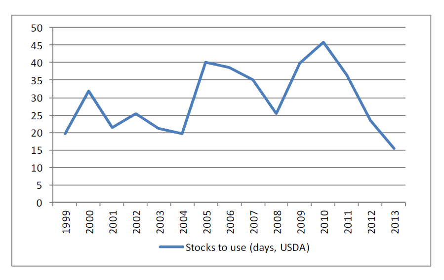 I förhållande till pris är relationen helt ur led, som vi ser i diagrammet nedan. Med så låga lager som USDA prognosticerar ligger priset för lågt. Det ”borde” ligga norr om 600 euro per ton.