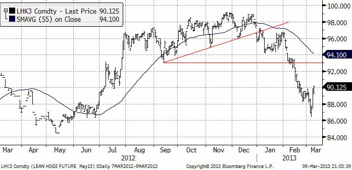 Grispriset (Maj 13) rekylerade upp kraftigt på rapporter om låga lager. Vi ser rekylen uppåt än så länge som en rekyl och inte som början på en trend uppåt.