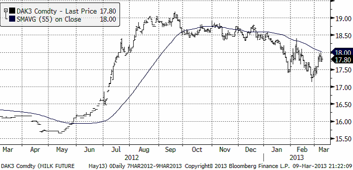 På andra sidan Atlanten fortsätter mjölkpriset att falla, som vi ser nedan. Prisuppgången i mars månad kommer säkerligen att följas av prisfall. Det ser ut som om nedgången började i fredags och kommer att fortsätta i resten av veckan.