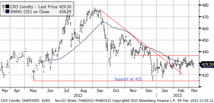 Rapspriset (november 2013) har fortsätt att röra sig ”sidledes”, såsom det gjort de tre senaste månaderna. Efter WASDE-rapporten och prisnedgången på sojabönor handlades även rapspriset ner.