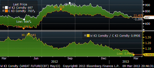 Det finns rapporter från USA att majs ersätts med vete i såväl två etanolfabriker som allmänt i foderblandningar. Detta gör att USDA:s foderefterfrågan i WASDE-rapporten kan vara helt underskattad. Nedan ser vi terminskurvorna för vete och majs. Notera att priserna för majs är omräknade från cent / 56 pund till cent / 60 bushels. När man handlar majsterminer på börsen handlar man dem i cent per bushel och en majs-bushel är 56 pund, medan en bushel vete är 60 pund. Maj-leverans för majs ligger alltså på 754 och vete på 697. Det är en jättestor skillnad när man dessutom betänker att vete innehåller betydligt mer värdefullt protein än majs.