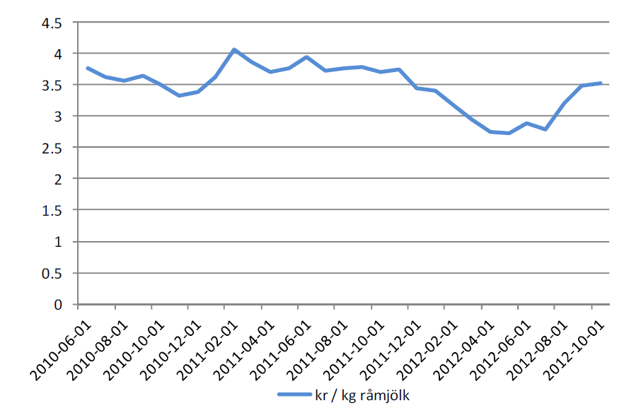 Det börsbaserade priset i svenska kronor steg från den sista september till den sista oktober från 3.48 kr per kilo till 3.52 kr. För att beräkna ett pris utifrån börsnoteringarna på smör och SMP utgår man från att 0.5 ton smör och 0.9 ton SMP ger 10 ton råmjölk. Formeln blir: