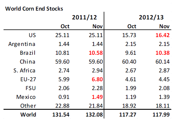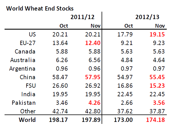 Utgående lager höjdes globalt. Det beror på att USDA antar att konsumtionen minskar. Man räknar t ex med ytterligare 1.5 mt lägre konsumtion i EU.