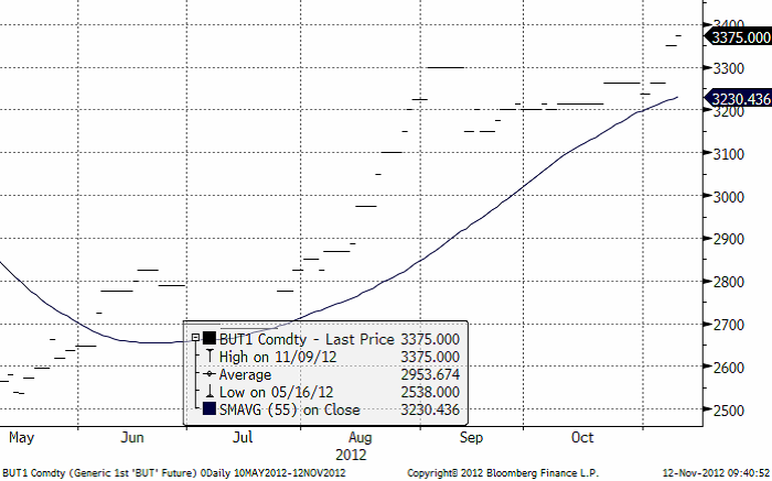Ser vi till kontraktet med leverans efter nästa års skörd, november 2013-kontraktet, har det brutit över alla nivåer och har tangerat 250 euro, där det funnits tillräckligt med säljordrar i väntan för att hindra priset att gå över, i alla fall än så länge. Om en rekyl nedåt kommer, vilket skulle kunna ske enbart för att folk som legat köpta vill ta hem vinster, ”borde” den gå ner mot 240.