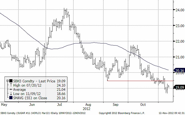 Priset på socker (mars 2013) befinner sig i en stark baissemarknad. Priset har just noterat nytt årslägsta och ligger i trenden för att söka en ny bottennotering.