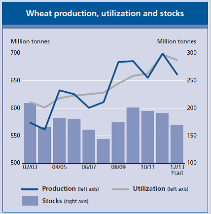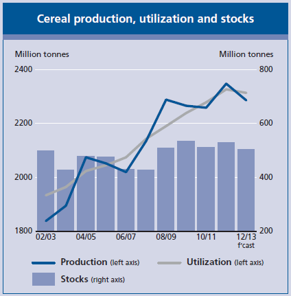 FAO skriver i sin senaste rapport att det globala utbudet och efterfrågan på spannmål är betydligt tightare än 2011/12 som en följd av lägre produktion som understiger efterfrågan och kraftigt minskande spannmålslager. Den globala spannmålsproduktionen 2012 förväntas falla med 2.7 procent från föregående års rekordskörd, och justeras nu ned till 2 284 mt frfån förra månadens estimat på 2 286 mt.