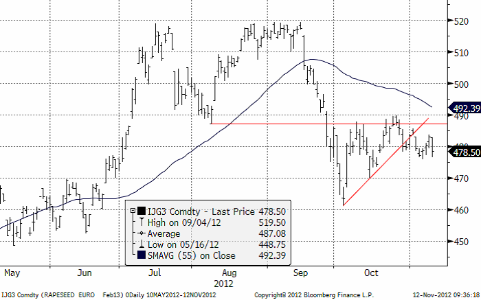 Europeiska lantbrukare kommer sannolikt att öka sådden av raps med 7% inför skörden 2013, delvis på bekostnad av vete, enligt Oil World. Höga priser och gynnsamma förhållanden vid sådd jämfört med förra året talar för en återhämtning. CNGOIC estimerar Kinas rapsproduktion 2012 till 12.2 mt, en minskning med 9.15% från förra året. Canola kontraktet med leverans i Jan13 föll tillbaka kraftigt under slutet av förra veckan och i början på denna vecka. Rapporter om att kanadensiska lantbrukare har ökat sin försäljning kraftigt under den senaste veckan pressade priserna.