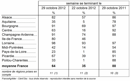 Sådden av höstgrödor pågår fortfarande i Frankrike och Storbritannien och har försenats av regn och även snö. I Frankrike var sådden av vete endast avklarad till 64% i slutet av förra månaden, jämfört med 88% året innan. FranceAgriMer säger att vete produktionen 2012/13 kommer att öka med 5.4 procent i år till 35.8 mt, vilket dock är en nedjustering med 185 000 ton från månaden innan som en följd av lägre avkastning (7.35 ton/ha).