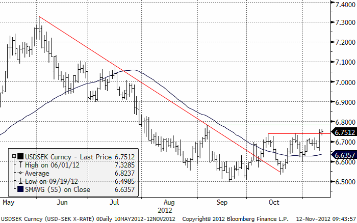 USDSEK har just brutit en viktig motståndsnivå. Det signalerar förestående uppgång. Nästa nivå ligger på 6.78. Bryts den finns möjlighet till kursuppgång till 6.90 i första hand. Det ser helt klart ”bullish” ut för dollarn mot kronan. Eftersom även euron ser stark ut, måste det vara kronan som är svag.