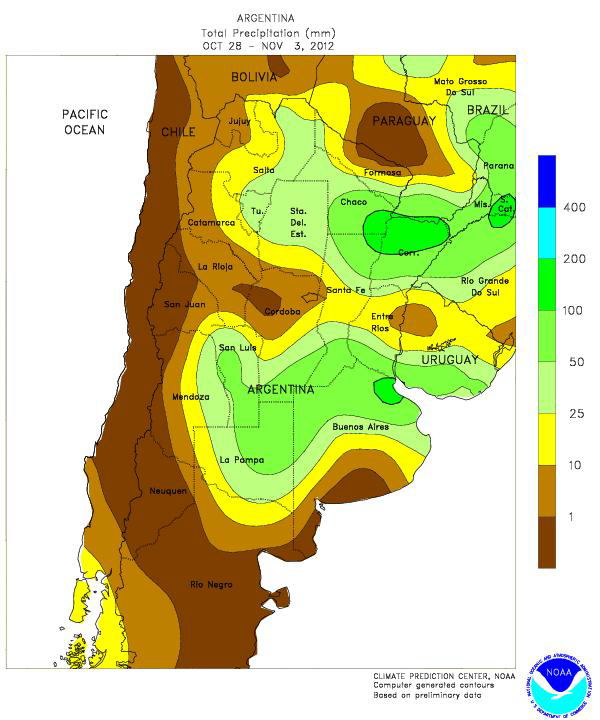 Södra Brasilien är torrt, men centrala och norra delarna har över normal nederbörd. Southern Oscillation Index ligger på +2.4, dvs samma nivå som den senaste månaden. Ett värde mellan +8 och -8 indikerar neutrala ENSO-förhållanden. Inte nog med att 2012 var ett tufft år för de amerikanska lantbrukarna på grund av den svåra torkan i stora delar av USA, dessutom slog stormen Sandy till och orsakade förödelse längs östkusten. Eftersom växtsäsongen i stort sett var klar i stora delar i dessa områden och många lantbrukare hade skyndat på skörden inför stormen så är den totala inverkan på jordbruket lyckligtvis inte så ödesdiger, även om det finns lokala områden där grödorna skadats svårt genom bl.a massiva översvämningar.