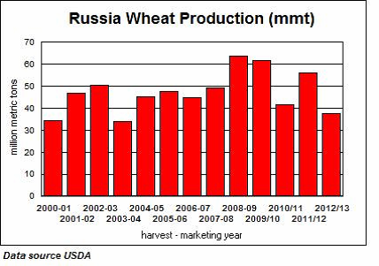 SovEcon uppskattar att Rysslands vete produktion 2012 kommer att uppgå till ca 37.5 mt, vilket är en nedjustering från tidigare prognos på 38.0 mt och lägre än USDA’s prognos på 38 mt. I Ryssland är spannmålsskörden i stort sett klar nu och ser ut att minska med 22.5 mt från 94.2 mt under 2011 till 71.7 mt.