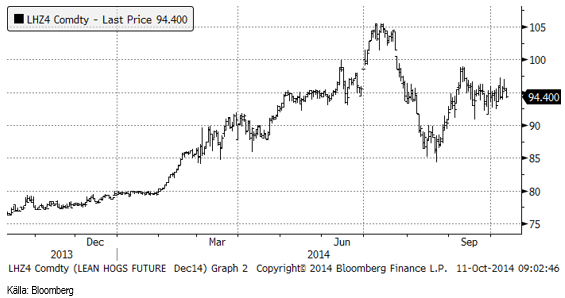 Lean hogs decemberkontrakt ligger kvar kring 95 cent per pund där priset legat den senaste månaden.