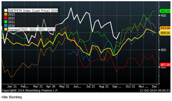 December 2014 – kontraktet på majs i Chicago handlas på 334 cent. Nästa års skörd, CZ5, handlas på 381.75 cent. Vi vet att hälften av lantbrukarna i USA har en kostnad på 400 cent per bushel och då är nästa års terminspris i lägsta laget för att man inte ska förvänta sig väsentligt lägre areal nästa år. Man ska komma ihåg att 334 cent för årets skörd avser majs som befinner sig i en silo, redo att lastas på fartyg. ”Farmgate-” priset är lägre. Det har talats om priser ner mot 200 cent på en del ställen.