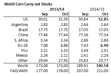 FAO höjde produktionsestimatet på global basis med 10 mt (!) till den nya rekordnivån 1018 mt. FAO höjer framförallt förväntningarna på produktionen i USA. USDA höjde även de produktionsestimatet för USA, men med 2 mt och på global basis med 3 mt till rekordnivån 990.69 mt. För USA höjdes yielden till 174.2 bushels per acre, vilket är i linje med vad vi påpekat tidigare. 174.2 är förmodligen för lågt ändå och kan komma att höjas. Skördad areal sänktes samtidigt av USDA från 83.8 miljoner acre till 83.1 miljoner.