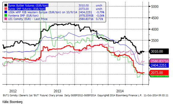 Terminerna på smör och SMP ligger kvar på samma nivå som de senaste två veckorna. Prisfallet verkar ha ebbat ut.