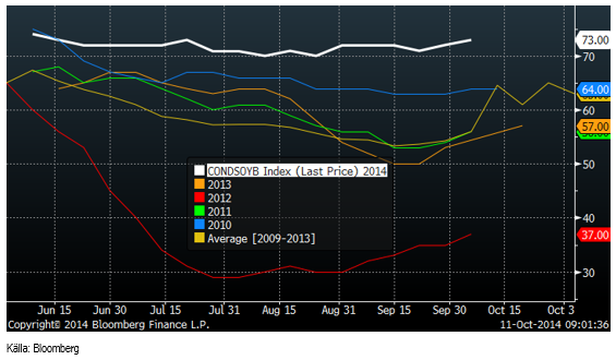 FAO räknar med att global konsumtion ökar med 7-8% på årsbasis, väsentligt högre än de 5% årlig tillväxt de hade för 2013/14. De ser en stark efterfrågan på både sojaolja och sojamjöl. FAO sänker därför utgående lager med 1 mt från september till oktober till 41 mt. Detta är ändå 10 mt högre utgående lager än FAO såg för 2013/14.