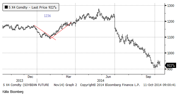 Sojabönorna (SX4) som vid månadsskiftet fick stöd vid 900 cent, rekylerade först upp tidigt förra veckan, men föll sedan rätt kraftigt efter USDA:s WASDE-rapport för oktober. Verkligheten gjorde sig påmind.
