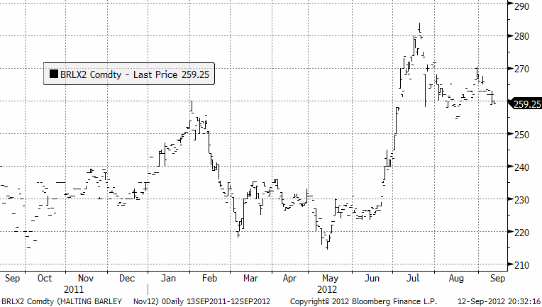 Novemberkontraktet på maltkorn ligger kvar kring 260 euro per ton och vi väntar oss sidledes rörelse i veckan som kommer.