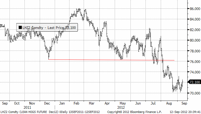 Grispriset befinner sig i en tydlig bear market. Men tycks ha kommit till en konsolideringsfas. 70 cent per pund ser ut att vara golvet på konsolideringsområdet.