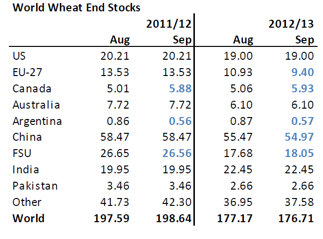 Utgående lager förändras inte i USDA:s rapport. Man sänker användningen av vete som foder, huvudsakligen i Ryssland. Notera att fd Sovjetunionen väntas ha högre utgående lager jämfört med vad man trodde i augusti!